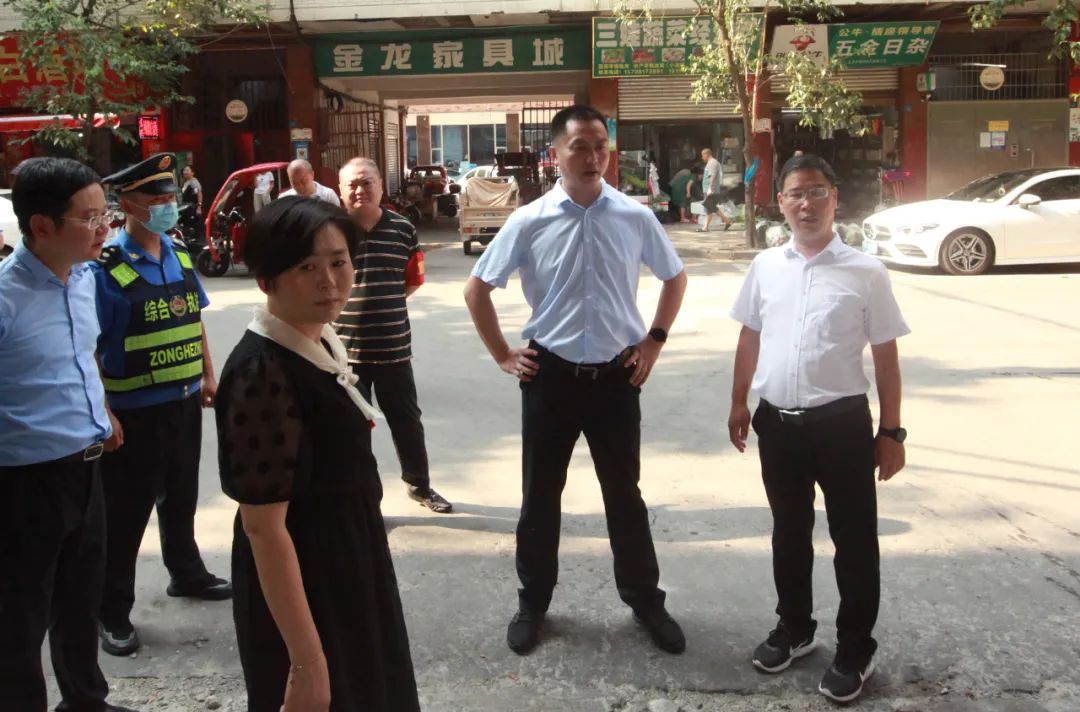 张国富、杜国栋一行先后到社区农贸市场、建材市场、小区楼栋和背街小巷进行实地察看,现场就飞线充电、墙面破损、环境卫生、交通秩序等突出问题进行充分讨论,积极研究解决方案。